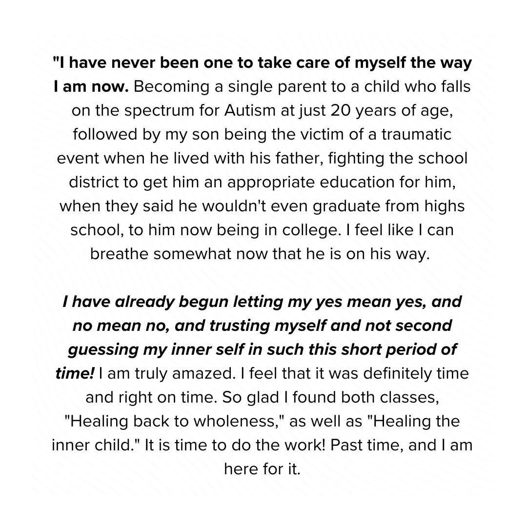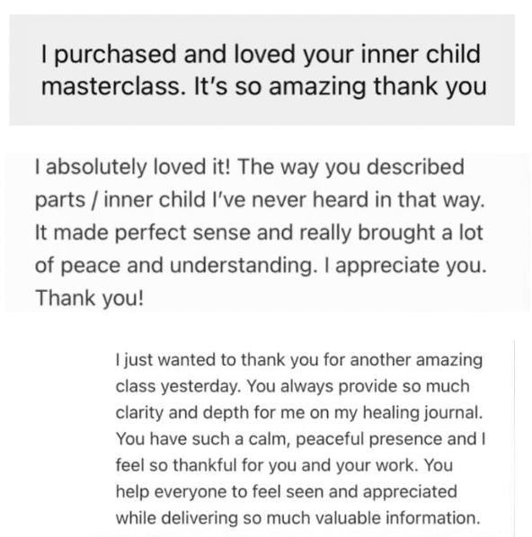 In Class 1, we’ll explore the way we talk to ourselves and how it impacts our inner voice. You’ll learn how to become more present with your inner child and build trust with them. I’ll share my personal journey with inner child work and give you tools to start the process of healing.